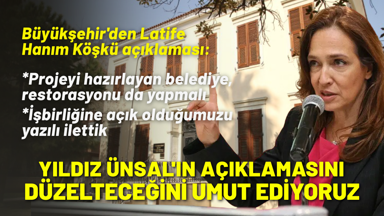 İzmir Büyükşehir Belediyesi, Latife Hanım Köşkü’nün restorasyonuna ilişkin kamuoyunda yer alan iddialara yazılı açıklamayla yanıt verdi. Açıklamada, Latife Hanım Köşkü, 2863 sayılı Kültür ve Tabiat Varlıklarını Koruma Kanunu kapsamında korunması gereken, İzmir'in ve ülkemizin simge yapılarından biridir. Mustafa Kemal Atatürk'ün annesi Zübeyde Hanım'ın son günlerini geçirdiği ve hayatını kaybettiği bu yapı, müze statüsünde olup kamuya açık bulunduğu hatırlatıldı.