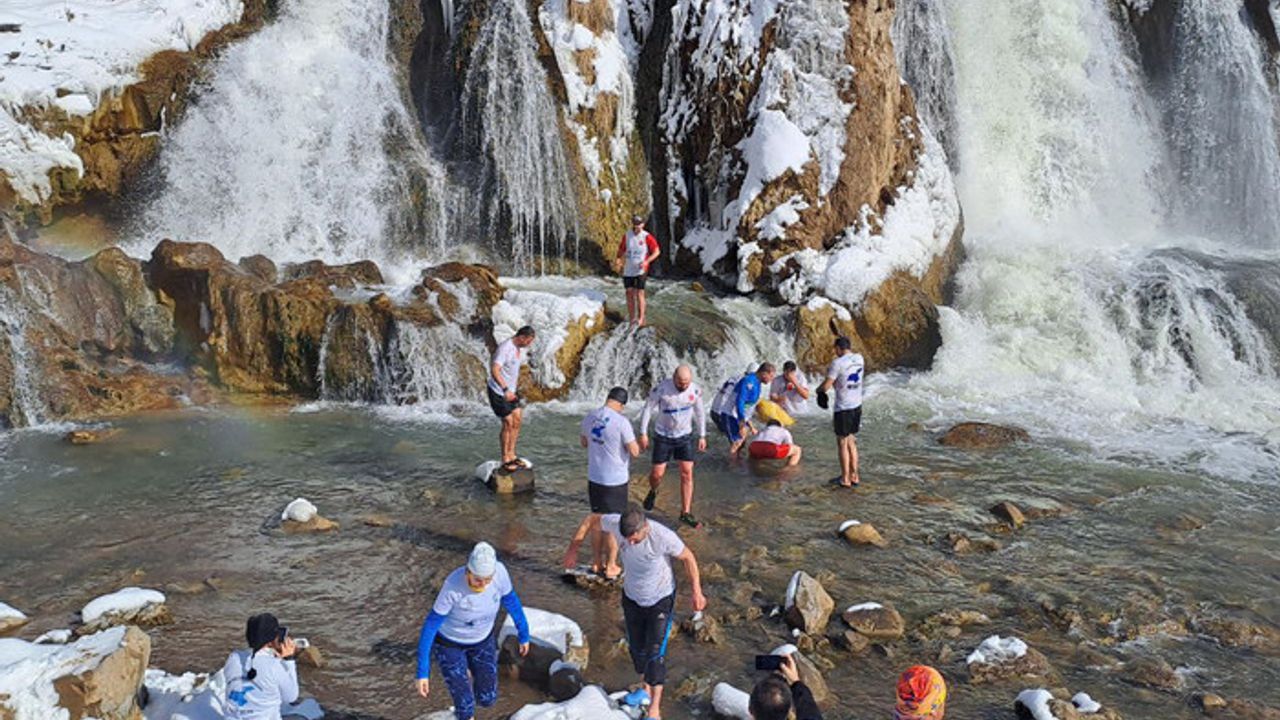 Van Gölü Aktivistleri Derneği üyesi yaklaşık 50 kişi, Muradiye Belediyesi’nin de destekleriyle bu yıl 5’ incisini gerçekleştirdikleri 'Kış Yüzme Şenliği'nde bir araya geldi. Kentin doğal güzelliklerine dikkat çekmek için yapılan şenlikte grup, eksi 6 derece hava sıcaklığında binlerce kişinin ziyaret ettiği Muradiye Şelalesi'nin buz gibi suyunda yüzdü. Etkinlikte İsrail'in Filistin'e yönelik saldırılarına tepki de gösteren grup, ‘Kahrolsun İsrail’ ve ‘Van Gölü kirlenmesin, mavi kalsın’ sloganları attı.