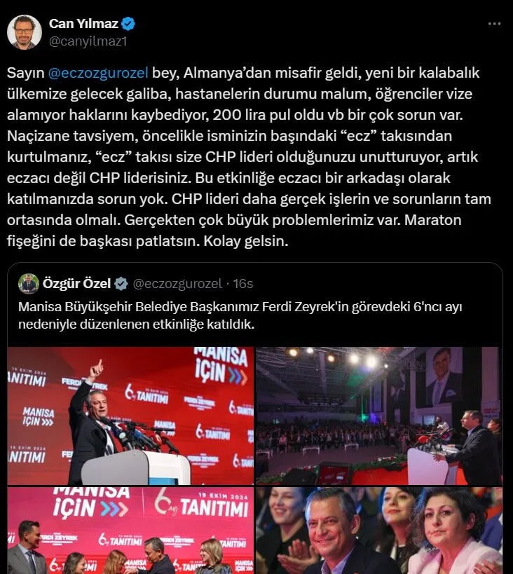 Komedyen Cem Yılmaz'ın ağabeyi, senarist ve yazar Can Yılmaz, Manisa Büyükşehir Belediye Başkanı Ferdi Zeyrek'in görevdeki 6'ncı ayı nedeniyle düzenlenen etkinliğe katılan CHP Genel Başkanı Özgür Özel'i X hesabından şu sözlerle eleştirdi: