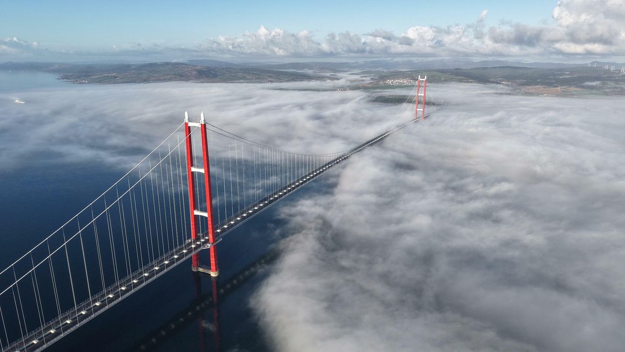 Çanakkale Boğazı'nda transit gemi geçişlerinin durmasına neden olan yoğun siste, 2 bin 23 metre orta açıklığıyla dünyanın en uzun orta açıklığa sahip asma köprüsü olan 1915 Çanakkale Köprüsü dronla görüntülendi.