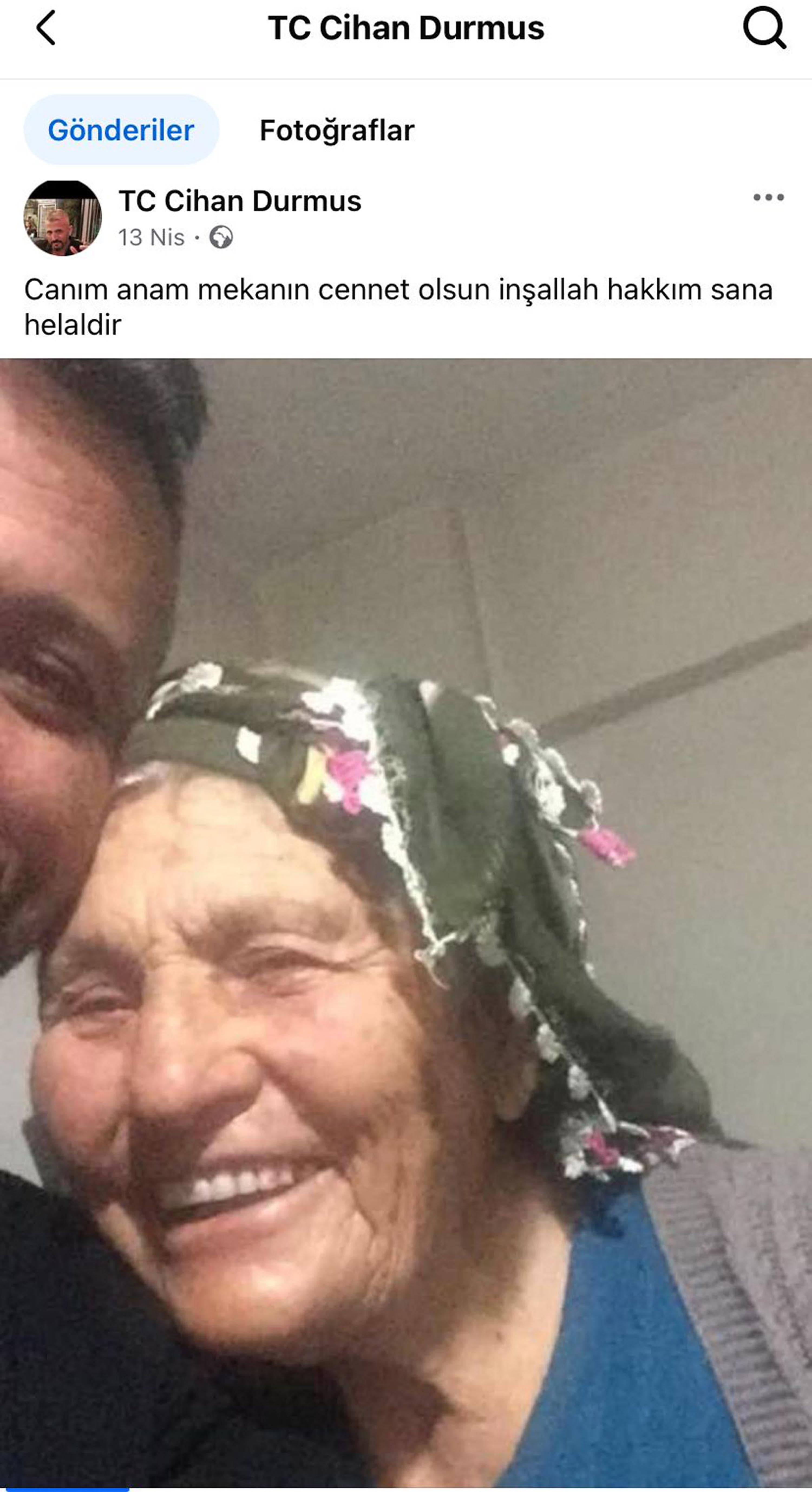Cinayet şüphelisi Cihan Durmuş'un annesinin öldüğü gün sosyal medya hesabından "Canım anam mekanın cennet olsun inşallah. Hakkım sana helaldir" paylaşımında bulunduğu ortaya çıktı.