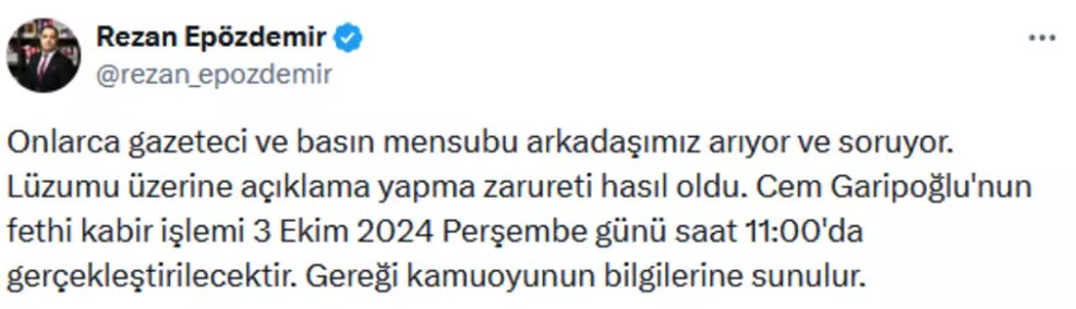 Münevver Karabulutun ailesinin avukatı Rezan Epözdemir de Garipoğlu'nun mezarının açılma tarihi duyurdu. Epözdemir "Onlarca gazeteci ve basın mensubu arkadaşımız arıyor ve soruyor. Lüzumu üzerine açıklama yapma zarureti hasıl oldu. Cem Garipoğlu'nun fethi kabir işlemi 3 Ekim 2024 Perşembe günü saat 11:00'da gerçekleştirilecektir. Gereği kamuoyunun bilgilerine sunulur." ifadelerini kullandı.