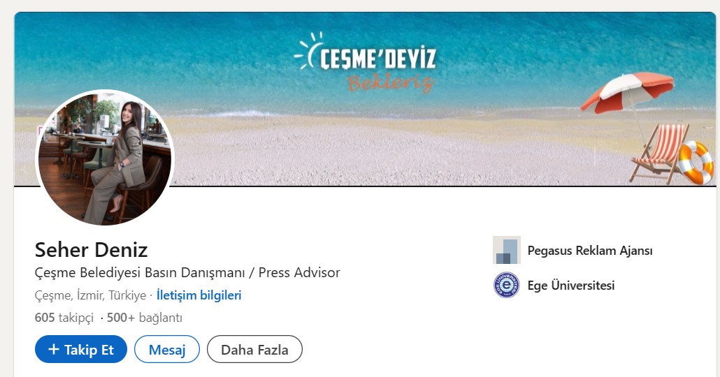 Fotoğrafta da belirttiği gibi Seher Deniz, Çeşme Belediyesi Basın Danışmanı ve Pegasus Reklam Ajansı Sahibi