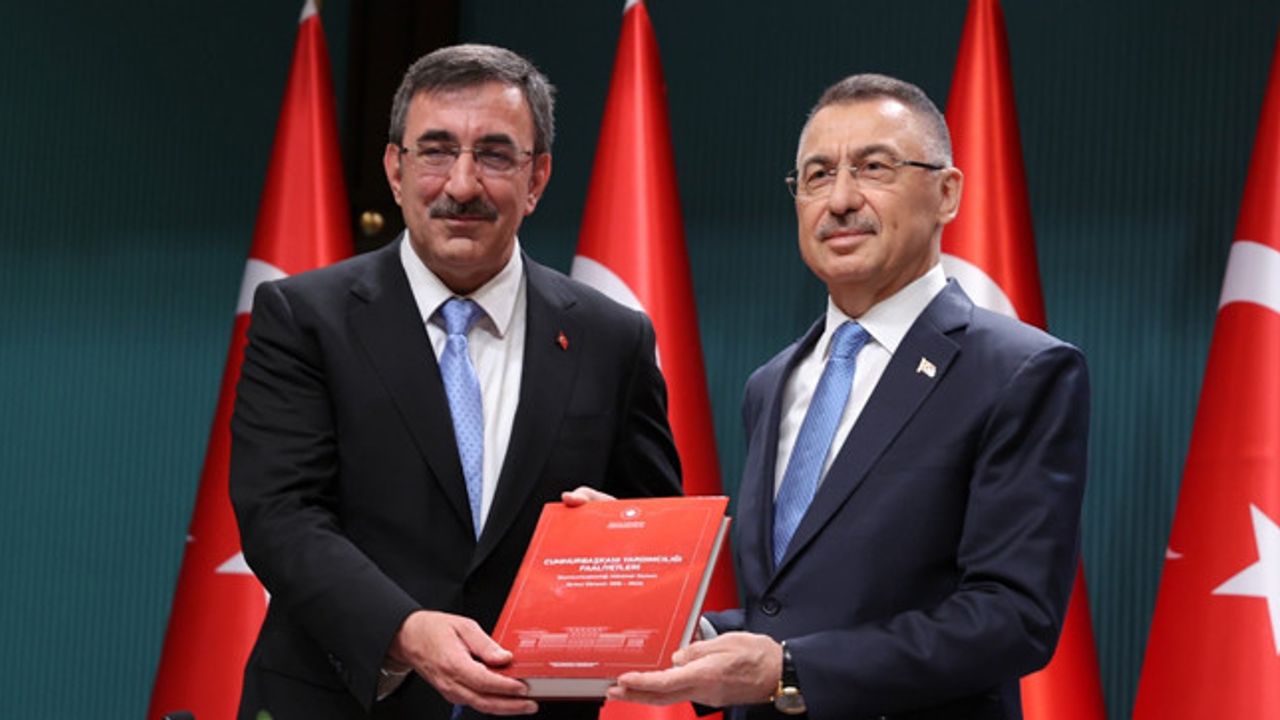 Cumhurbaşkanlığı Külliyesi'nde gerçekleştirilen törende konuşan Oktay, Cumhuriyet’in 100’üncü yılında, Türkiye’nin kaderini etkileyecek bir seçimin gerçekleştirildiğini söyledi. Oktay, son 5 yıl içinde, hem Türkiye’yi hem de dünyayı etkileyecek çapta büyük zorluklar yaşandığını belirterek, "Küresel çaptaki çevresel ve ekonomik krizler, yanı başımızda patlak veren Rusya-Ukrayna savaşı, bütün dünyada hayatı adeta felç eden pandemi gibi olağanüstü problemlerle mücadeleyle geçen bir 5 yıl. Bu küresel sorunların üstüne asrın felaketi olarak anılan ve 11 ilimizi etkileyen deprem felaketi. Bu felaketin yaralarını sarmak için gece gündüz verilen uğraşlar. Hamdolsun, bütün bu zorlu süreçlerden alnımızın akıyla çıktık. Üstelik, bu zorlu süreçlerde hem bizi onurlandıracak, hem de milletimizi gururlandıracak eser ve hizmetlere imza attık. Cumhurbaşkanı Yardımcısı olarak; Ekonomi Koordinasyon Kurulu, Bağımlılıkla Mücadele Yüksek Kurulu, Türkiye Coğrafi Bilgi Sistemi Kurulu, Yatırım Ortamını İyileştirme Koordinasyon Kurulu ve Ulusal Yapay Zeka Stratejisi Yönlendirme Kurulu çalışmalarına başkanlık ettim. Kamu hizmetlerine daha hızlı ve kolay erişim sağlayan e-devlet ve bürokrasinin azaltılması çalışmalarının, Cumhurbaşkanlığı Dijital Dönüşüm Ofisi başta olmak üzere tüm bakanlık, kurum ve kuruluşların eşgüdümünde ilerlemesini sağladık. Görevi devralan yeni Cumhurbaşkanı Yardımcımız Sayın Cevdet Yılmaz’ın Cumhurbaşkanımız liderliğinde bu çıtayı çok daha yükseğe taşıyacağına yürekten inanıyorum" dedi.