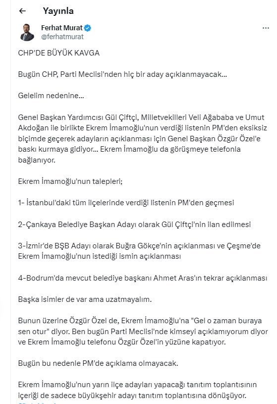 CHP'deki bu kavgayı, iletişimci ve TV yorumcusu Ferhat Murat kendisine ulaşan kulis bilgisi üzerinden sosyal medya hesabından yazdı.