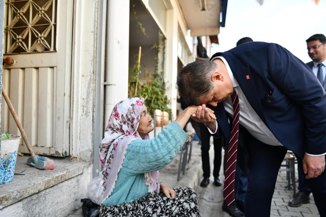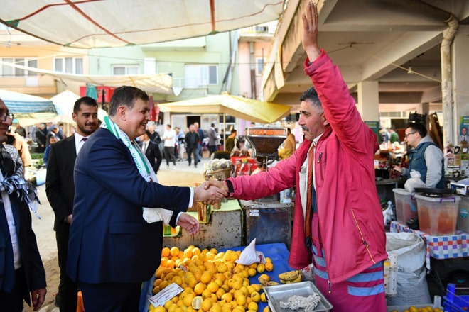 İzmir Büyükşehir Belediye Başkan Adayı Dr. Cemil Tugay, ilçede kurulan halk pazarını da ziyaret etti. Pazarcı esnafı ve vatandaşlarla sohbet eden, alışveriş yapan Başkan Tugay, taktığı puşiyi isteyen bir kadını da kırmadı.