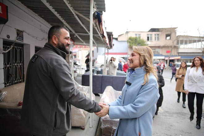 Saha çalışmalarına gün içerisinde devam eden Mutlu, İkiçeşmelik ve Anafartalar caddelerinde esnaf turu gerçekleştirdi. Dükkanlara tek tek girerek esnafın taleplerine kulak veren Mutlu, “Buradan Kemeraltı ve Agora’ya doğru gerekli düzenlemeleri hızla yapacağız. Mimar olduğum için buraları çok gezdim ve çalışmalar yaptım. Seçimden sonra gelip sizlerin de fikirlerini dinleyeceğiz. Pırıl pırıl, şıkır şıkır bir İkiçeşmelik yaratacağız. Basmane bölgesini çok seviyorum. Çok köklü bir semt. Hep beraber yeniden eski değerine kavuşturacağız” dedi. Belediyeden beklentilerini dile getiren esnaf ise, “Allah’ın izniyle inşallah siz başa geleceksiniz. Gönlümüz sizden yana” sözleriyle Mutlu’ya destek verdi.