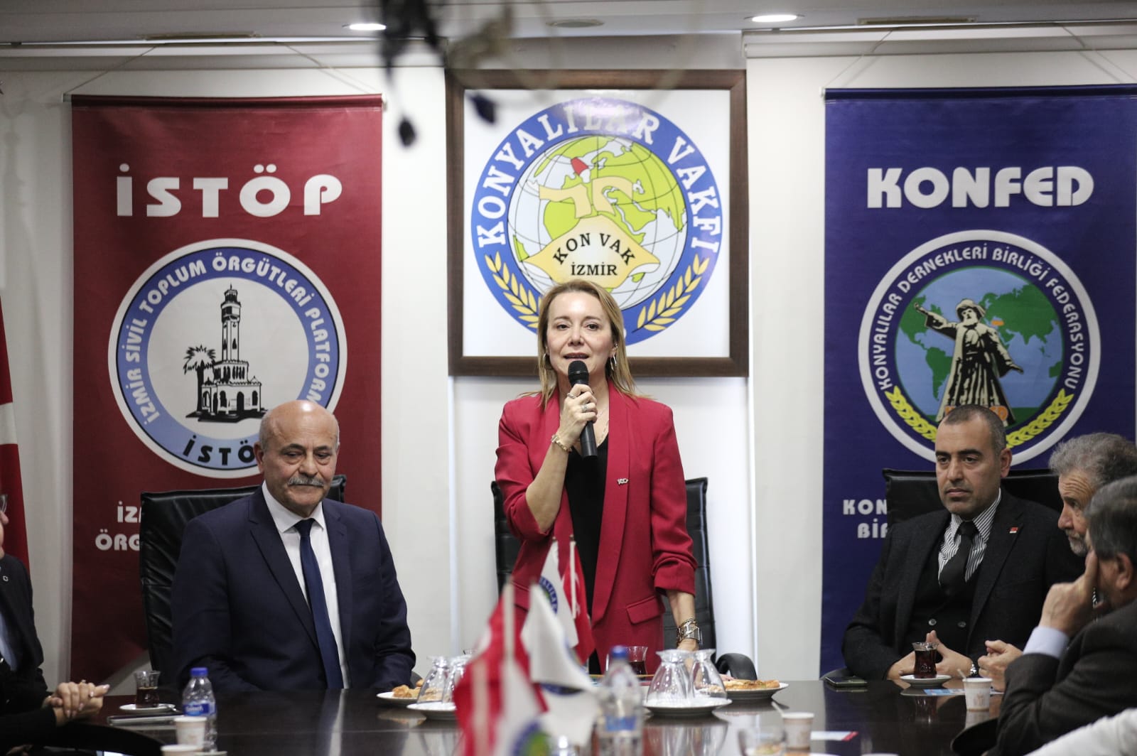 Daha sonra Konyalılar Vakfı’nı ziyaret eden Başkan Adayı Mutlu, Vakıf Başkanı Mehmet Aydoğan ve üyelerle buluştu. Sivil toplum kuruluşlarında ve meslek odalarında üretilen fikirlerin kıymetini çok iyi bildiğini dile getiren Mutlu, “Kente bu kadar duyarlı ve bilinçli yaklaşan bir sivil toplum kuruluşu ile omuz omuz yürümek bizi daha fazla güçlendirir. Konak, İzmir’in en zengin bölgelerinden. Siz Konya’dan İzmir’e geldiniz, ben de suyun öte yakasından. Hepimiz burada buluştuk. İzmir ve Konak’ı bu kadar değerli kılan da farklılıklarımız ama hepimizin aynı yerde yan yana yürümesi. Bu yürüyüşte sizlerle birlikte olmak çok önemli. Önümüzdeki 5 yılda birlikte yapacağımız çalışmalar için sivil toplum kuruluşlarının yerinin çok ayrı olacağını Mehmet Bey söyledi. Hakikaten ben meslek odasından geldiğim için sivil toplum kuruluşlarında ve meslek odalarında üretilen fikirlerin kıymetini çok iyi biliyorum. Bir belediye başkanı için oralardan gelen fikirler paha biçilemez. Hiç merak etmeyin ben sizlerle yol yürüyeceğim” diye konuştu.