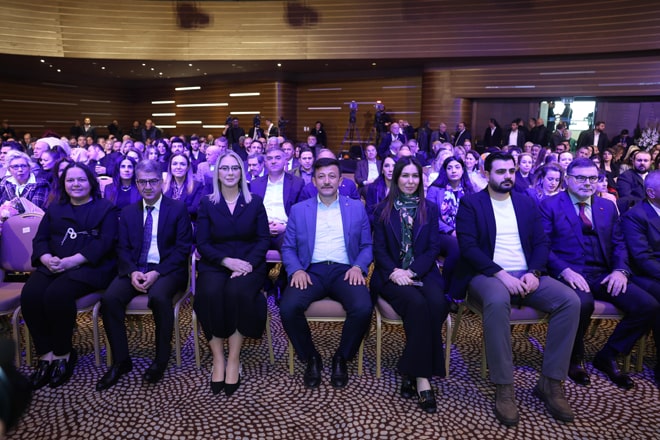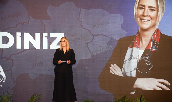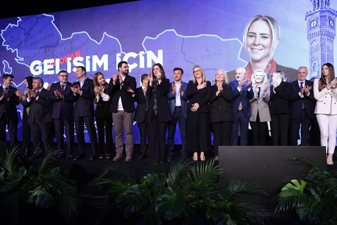 'Konak için tam zamanı' sloganıyla seçim çalışmalarını sürdüren Çankırı, toplantıya seçim şarkısını salona katılım sağlayanlarla birlikte söyledi.