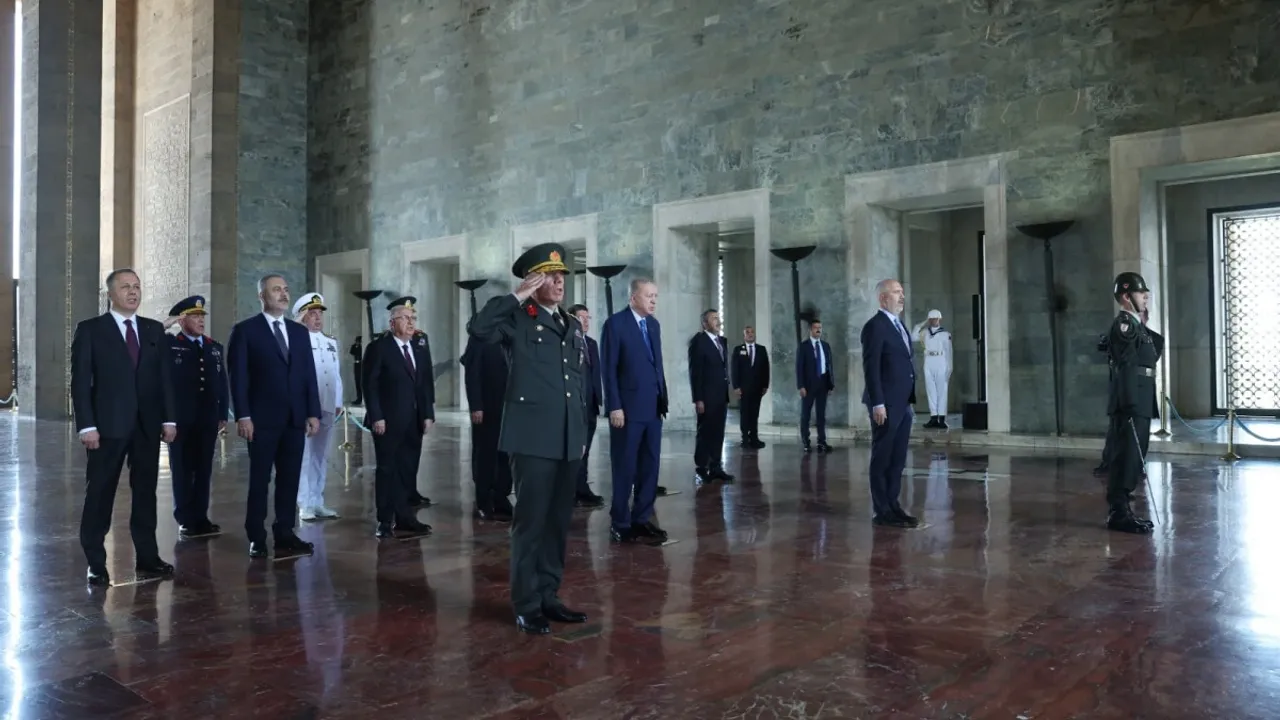 Cumhurbaşkanı Erdoğan, beraberinde Cumhurbaşkanı Yardımcısı Cevdet Yılmaz, Adalet Bakanı Yılmaz Tunç, Dışişleri Bakanı Hakan Fidan, Hazine ve Maliye Bakanı Mehmet Şimşek, İçişleri Bakanı Ali Yerlikaya, Milli Eğitim Bakanı Yusuf Tekin, Milli Savunma Bakanı Yaşar Güler, Genelkurmay Başkanı Orgeneral Metin Gürak, Kara Kuvvetleri Komutanı Orgeneral Selçuk Bayraktaroğlu, Deniz Kuvvetleri Komutanı Oramiral Ercüment Tatlıoğlu ve Hava Kuvvetleri Komutanı Hava Orgeneral Ziya Cemal Kadıoğlu ile Aslanlı Yol'da yürüdü. Cumhurbaşkanı Erdoğan, ay yıldız motifli çelengi Atatürk'ün mozolesine bıraktı. Ardından saygı duruşunda bulunuldu, İstiklal Marşı okundu. Cumhurbaşkanı Erdoğan başkanlığındaki heyet, mozoleye çıkan merdivenin önünde fotoğraf çektirdikten sonra Misak-ı Milli Kulesi'ne geçti.