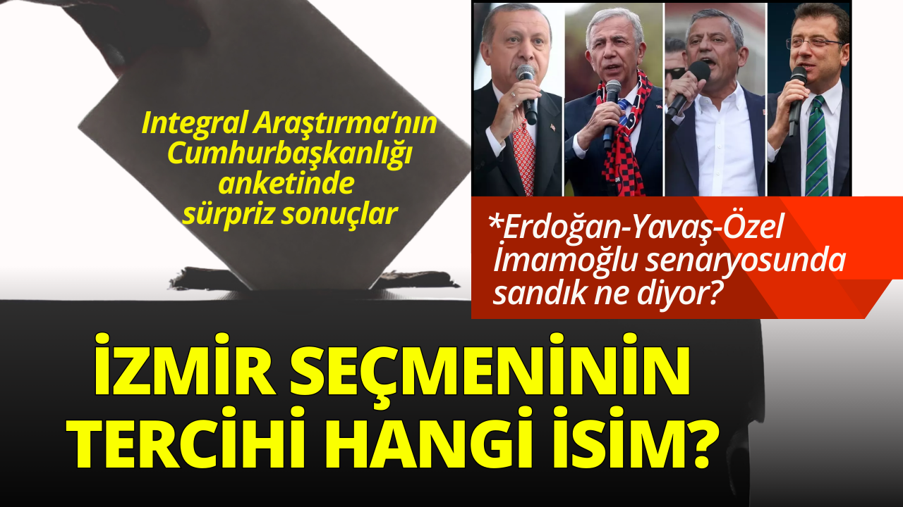 İzmir merkezli İntegral araştırma Ocak 2026 araştırmasının sonuçlarını paylaştı. Kent genelinde 2000 kişiyle telefonla yapılan araştırmada katılımcılara olası Cumhurbaşkanlığı senaryoları soruldu. Buna göre CHP’nin olası adayları Ekrem İmamoğlu, Mansur Yavaş ve Özgür Özel’in mevcut Cumhurbaşkanı Recep Tayyip Erdoğan’la yarışma ihtimali ayrı ayrı sorulduğunda Mansur Yavaş’ın önceki yıllarda olduğu gibi hala İzmir seçmeni için ilk tercih olduğu tespit edildi.