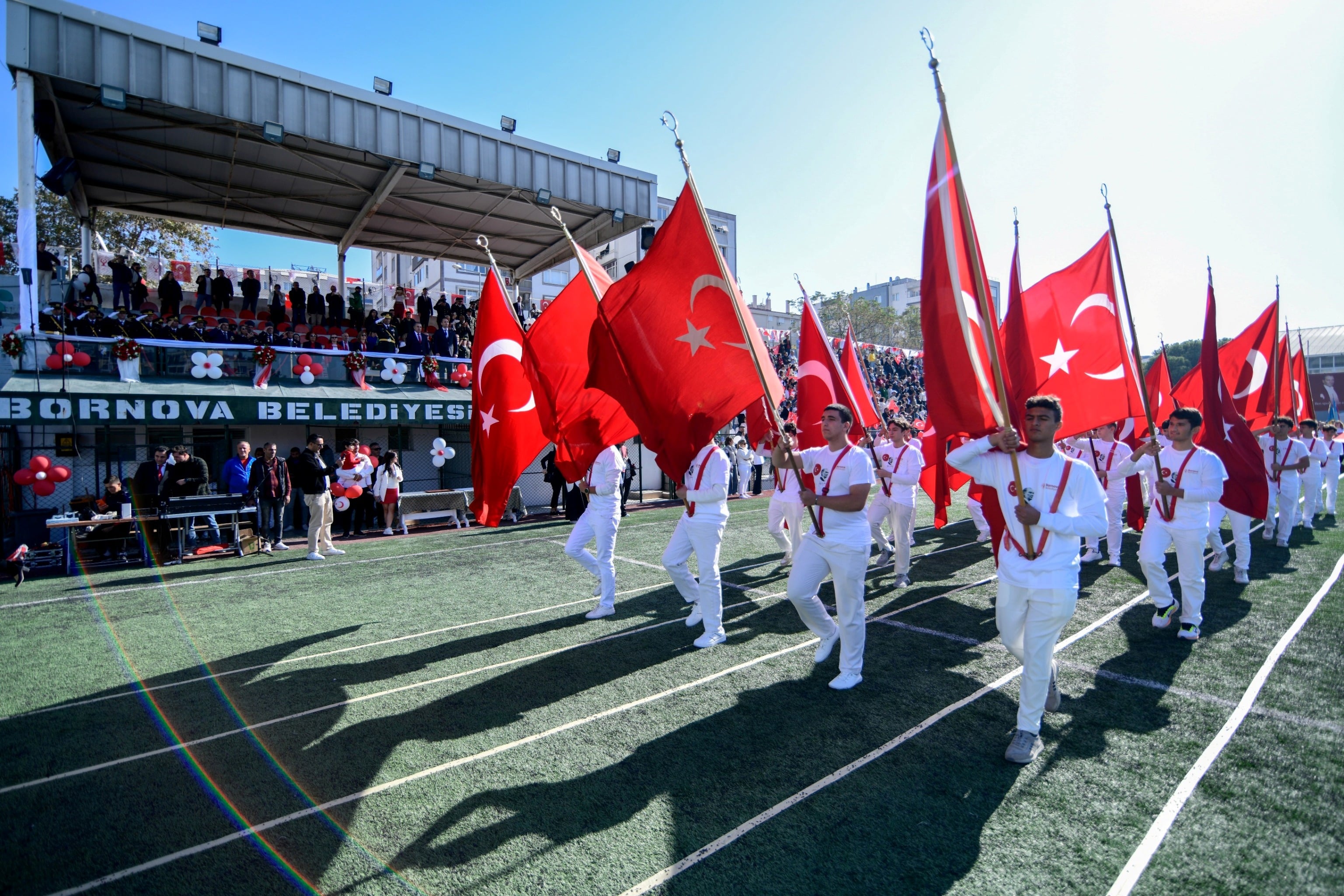 Cumhuriyet'in 101. yılı coşkusu Bornova Şehir Stadı'nda düzenlenen resmi törenle başladı. Bornova Kaymakamı Muzaffer Şahiner, Bornova Belediye Başkanı Ömer Eşki ve Garnizon Komutanı Tuğgeneral Ömer Şahin Selvi'nin katıldığı törende şiirler okundu, trambolin sporcuları, cimnastikçiler, taekwondocular ve halk oyunları ekipleri etkileyici gösteriler sundu. Ellerinde Türk bayraklarıyla kalp şekli oluşturan öğrenciler, alanı dolduran Bornovalılardan büyük alkış aldı. Törende ayrıca Cumhuriyet Kupası Kros Yarışması'nda dereceye giren sporcular ödüllerini aldı. Resmi törenin ardından vatandaşların yoğun katılımıyla Bornova Şehir Stadı'ndan Cumhuriyet Meydanı'na Cumhuriyet Şeref Yürüyüşü gerçekleştirildi.