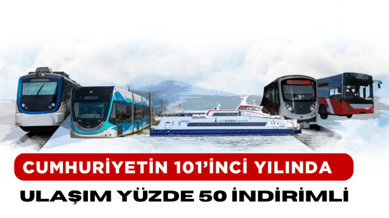 İzmir Büyükşehir Belediyesi, 29 Ekim Cumhuriyet Bayramı’nın 101’inci yıl dönümünde kentteki ulaşım tarifesinde yüzde 50’lik indirime gitti. İzmir Büyükşehir Belediyesi Ulaşım Koordinasyon Merkezi’nin (UKOME) aldığı karar uyarınca vatandaşlar gün boyunca mevcut toplu ulaşım ücret tarifesinin yarısı tutarında ödeme yapacak.