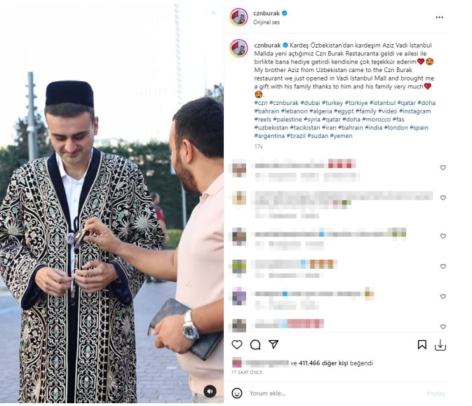 Aylar önce lüks araçlarını satarak yeni mekanı için harcayan Czn Burak, Özbek hayranından gelen araba hediyesini 53,8 milyon takipçisinin bulunduğu Instagram hesabından yayınladı. Özbek hayranının son model araba hediyesi karşısında duygusal anlar yaşayan fenomen, "Allah keselerine bereket versin" ifadelerini kullandı. Hediyeyi teslim aldığı anlarda çekilen bir videoyu yayınlayan Czn Burak, "Kardeş Özbekistan'dan kardeşim Aziz Vadi İstanbul Mall'da yeni açtığımız Czn Burak Restaurant'a geldi ve ailesi ile birlikte bana hediye getirdi kendisine çok teşekkür ederim" dedi.