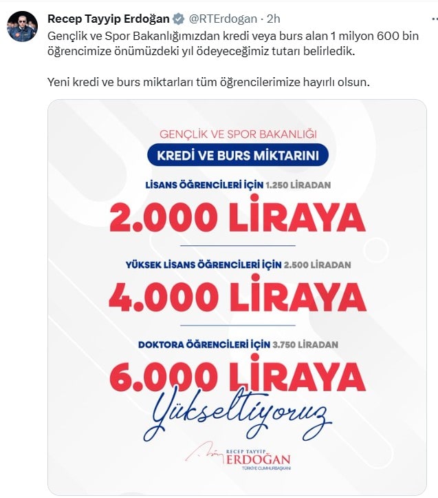 2024 yılında kredi ve burslar artıyor. Kredi veya burs alan 1 milyon 600 bin öğrencimize önümüzdeki yıl ödeyeceğimiz rakamları açıklıyorum. 2024’te lisans öğrencileri için bin 250 liradan 2 bin liraya, yüksek lisans öğrencileri için 2 bin 500 liradan 4 bin liraya, doktora öğrencileri için 3 bin 750 liradan 6 bin liraya çıkartıyoruz. Yeni kredi ve burs miktarlarının tüm öğrencilere hayırlı olmasını diliyorum.