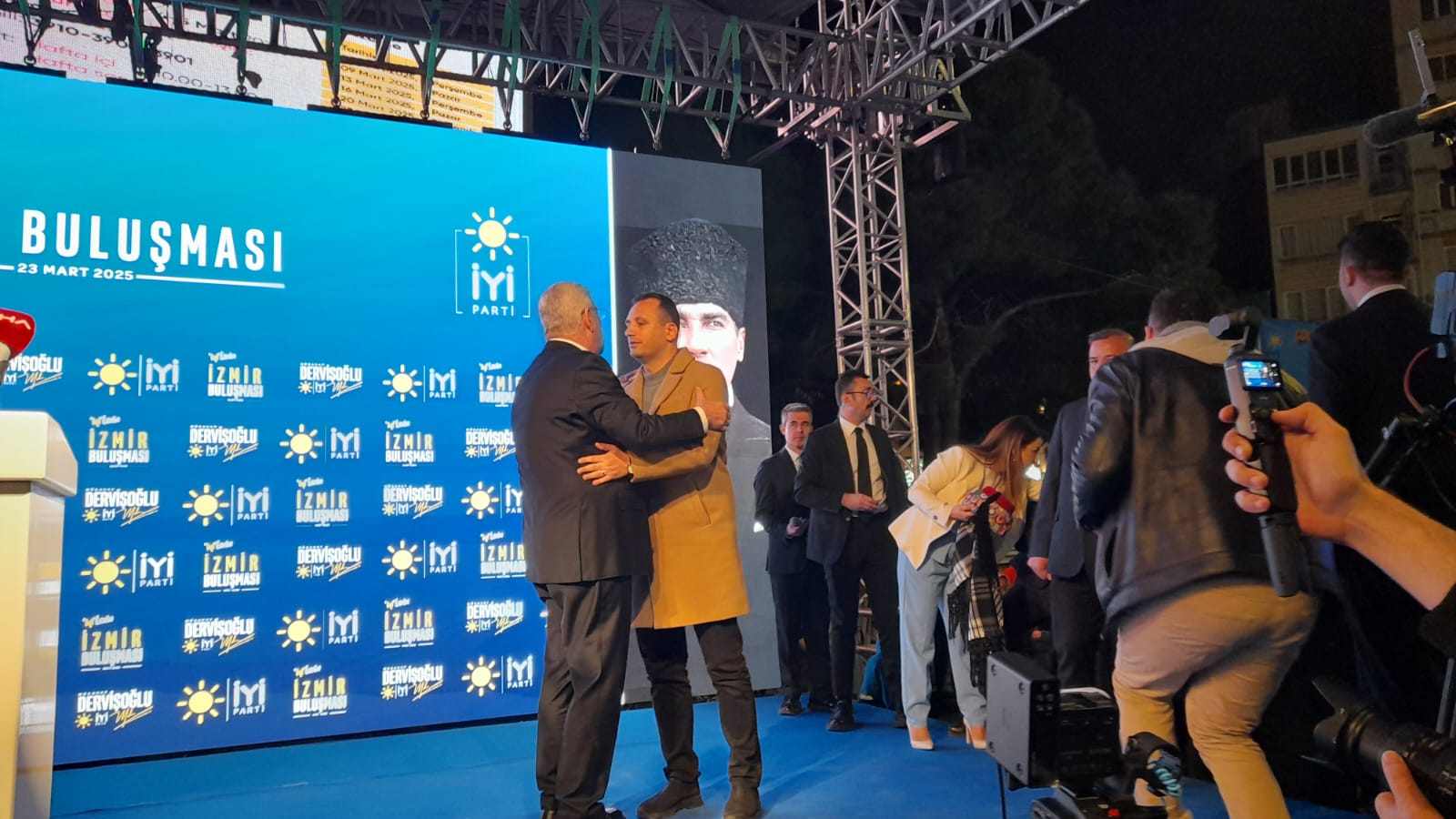 İYİ Parti Lideri Müsavat Dervişoğlu'nun konuşmasının ardından sahneye Bornova Belediye Başkanı Ömer Eşki de katılarak, selamlaştılar.