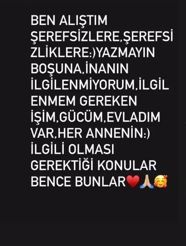 Erken, yaptığı paylaşımda, ” Ben alıştım şerefsizlere, şerefsizliklere... Yazmayın boşuna inanın ilgilenmiyorum. İlgilenmem gereken işim, gücüm, evladım var. Her annenin ilgili olması gerektiği konular bence bunlar” ifadelerini kullandı.