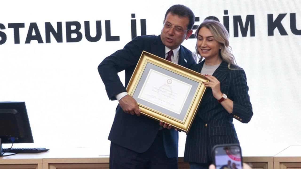 İmamoğlu mazbatası elinde eşi ve partililerle birlikte poz verdi.
