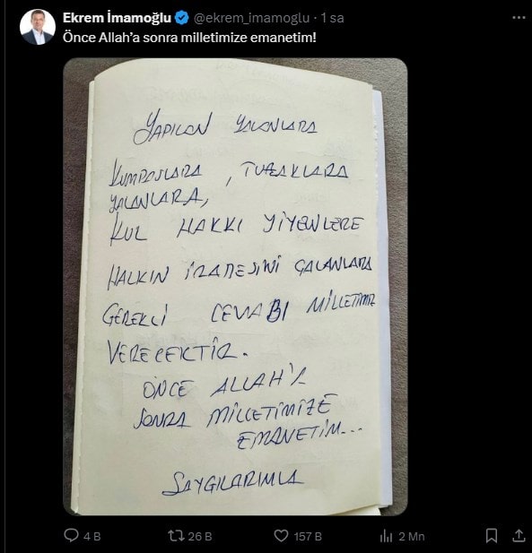Sabah saatlerinde evinde arama yapılarak gözaltına alınan İstanbul büyükşehir Belediye Başkanı Ekrem İmamoğlu'ndan ilk mesaj geldi. İmamoğlu'nun not kağıdına yazdığı mesajı X hesabından paylaşıldı.