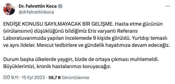 Sağlık Bakanı Fahrettin Koca, sosyal medya hesabından "Endişe konusu sayılmayacak bir gelişme" başlığı altında Eris varyantının Türkiye'de görüldüğünü açıkladı.