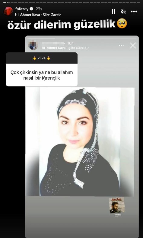 Son zamanlarda yaptığı açıklamalar ve paylaşımlarla sık sık adından söz ettiren Farah Zeynep Abdullah, bir kadın takipçisinin "Çok çirkinsin ya ne bu Allah'ım nasıl bir iğrençlik" yorumuna sessiz kalamadı. Takipçisinin adını ve fotoğrafını ifşa eden Abdullah, "Özür dilerim güzellik" ifadelerini kullandı.