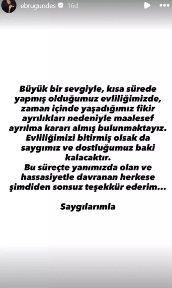 Evliliğimizi bitirmiş olsak da saygımız ve dostluğumuz baki kalacaktır. Bu süreçte yanımızda olan ve hassasiyetle davranan herkese şimdiden sonsuz teşekkür ederim... Saygılarımla" ifadelerini kullandı.