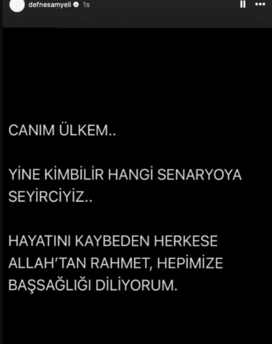 "Canım ülkem... Yine kim bilir hangi senaryoya seyirciyiz... Hayatını kaybeden herkese Allah'tan rahmet, hepimize başsağlığı diliyorum" ifadelerine yer verdi.