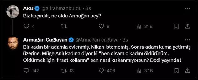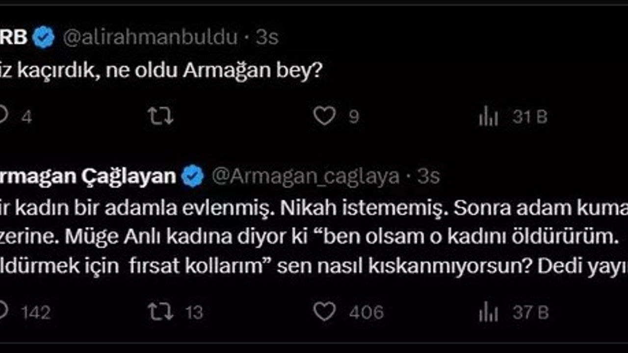 Armağan Çağlayan Müge Anlı'ya sosyal medya üzerinden tepki gösterdi. Armağan Çağlayan izlediği yayından sonra sosyal medyada "Müge Anlı da delirdi! Bayağı bayağı!" dedi.