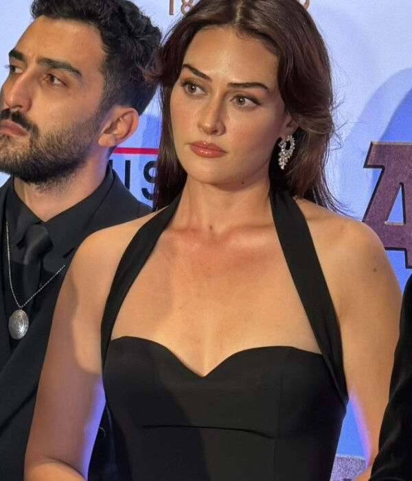 Güzel oyuncu Esra Bilgiç galaya siyah uzun yırtmaç ve kuyruk detaylı askılı elbisesiyle katıldı.