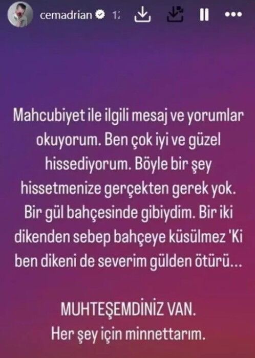 Cem Adrian "Mahcubiyet ile ilgili mesaj ve yorumlar okuyorum. Ben çok iyi ve güzel hissediyorum. Böyle bir şey hissetmenize gerçekten gerek yok. Bir gül bahçesinde gibiydim. Bir iki dikenden sebep bahçeye küsülmez 'ki ben dikeni de severim gülden ötürü...' Muhteşemdiniz Van. Her şey için minnettarım" paylaşımında bulundu.
