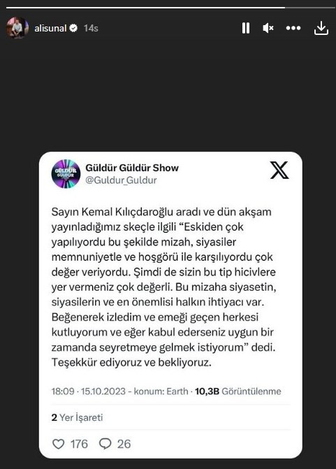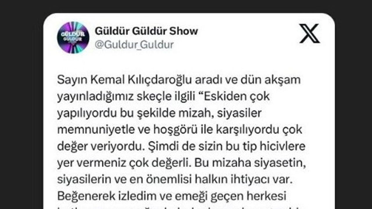 Skeci izleyen Kemal Kılıçdaroğlu ise ekibi aradı. Güldür Güldür Show'un sosyal medya hesabından yapılan paylaşımda şu ifadelere yer verildi: "Sayın Kemal Kılıçdaroğlu aradı ve dün akşam yayınladığımız skeçle ilgili 'Eskiden çok yapılıyordu bu şekilde mizah, siyasiler memnuniyetle ve hoşgörü ile karşılıyordu çok değer veriyordu. Şimdi de sizin bu tip hicivlere yer vermeniz çok değerli. Bu mizaha siyasetin, siyasilerin ve en önemlisi halkın ihtiyacı var. Beğenerek izledim ve emeği geçen herkesi kutluyorum ve eğer kabul ederseniz uygun bir zamanda seyretmeye gelmek istiyorum' dedi. Teşekkür ediyoruz ve bekliyoruz."