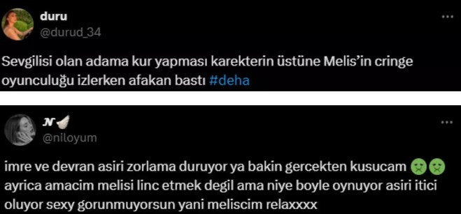 Devran'ın güzeller güzeli Esme'siyle yaşadığı aşk da seyircinin sevdiği detaylardan oldu. İkili arasında yaşanan diyaloglar var Devran'ın Esme'ye olan aşkı her yeni bölümde gündem oluyor. Sezonun en çok sevilen çiftleri arasına girdiler. Dizide bu ikilinin arasını bozacağı iddia edilen karakter olan İmre de son bölümlerde dikkat çekmeye başladı. Melis Sezen'in hayat verdiği karakter ise sevilmedi.
