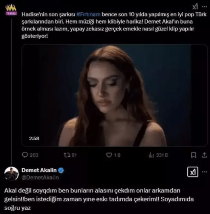 Kullanıcının, "Hadise'nin son şarkısı Fırtınam bence son 10 yılda yapılmış en iyi pop Türk şarkılarından biri. Hem müziği hem klibiyle harika! Demet Akal'ın buna örnek alması lazım, yapay zekasız gerçek emekle nasıl güzel klip yapılır gösteriyor!" yorumuna Demet Akalın'ın cevabı çok sert oldu.