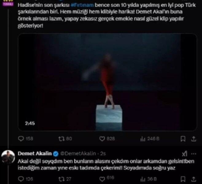 Sosyal medyada bir kullanıcı, Hadise ile Demet Akalın’ı kıyaslayan bir paylaşımda bulunarak; "Hadise'nin son şarkısı 'Fırtınam', bence son 10 yılda yapılmış en iyi pop Türk şarkılarından biri. Hem müziği hem klibiyle harika! Demet Akalın'ın buna örnek alması lâzım, yapay zekâsız gerçek emekle nasıl güzel klip yapılır gösteriyor" ifadelerini kullandı.