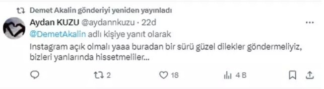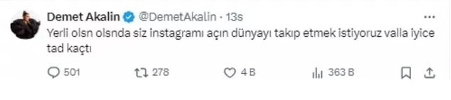 Akalın "Yerli olsun olsun da siz Instagram'ı açın. Dünyayı takip etmek istiyoruz vallaha iyice tadı kaçtı." ifadelerini kullandı.