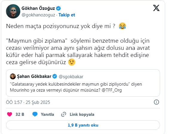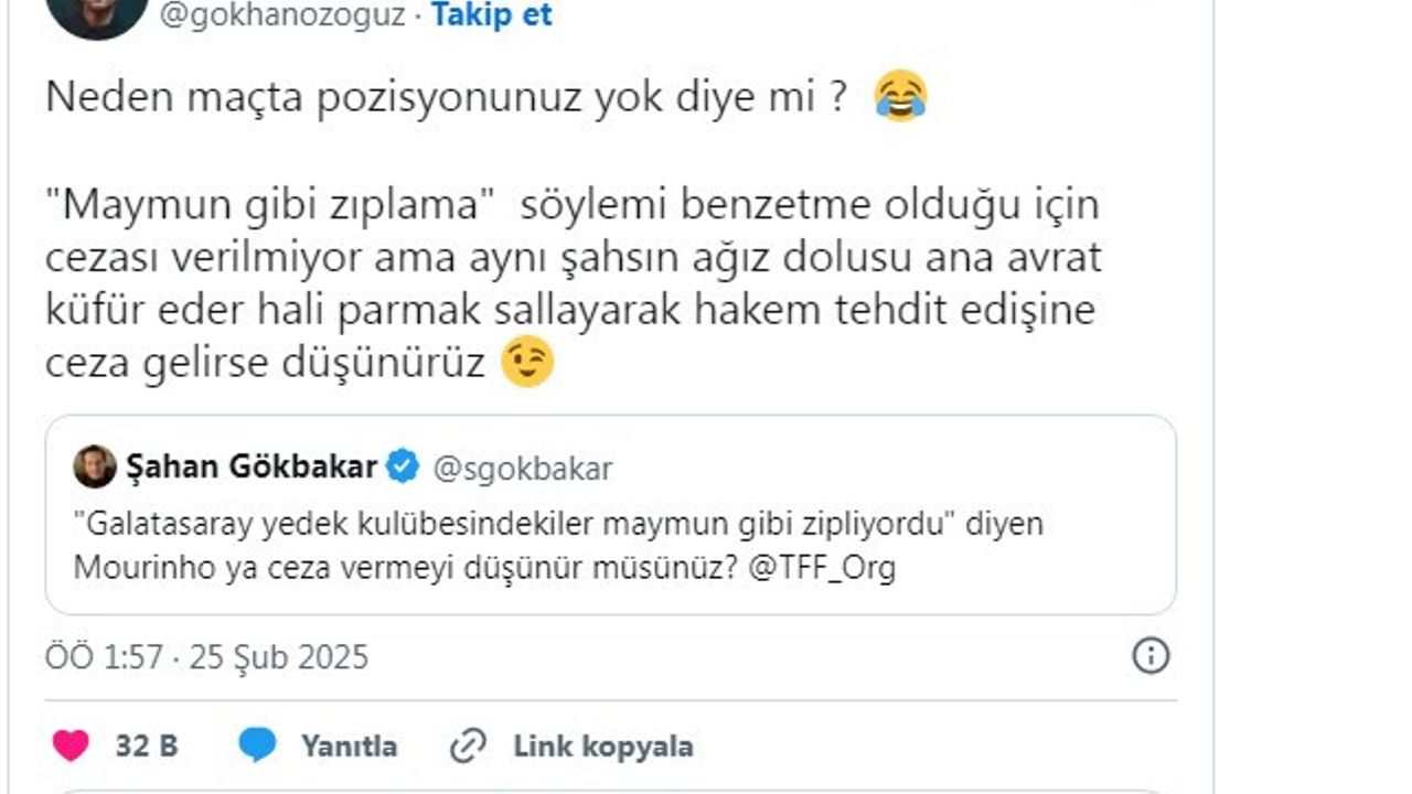 Şahan Gökbakar'ın paylaşımına Athena grubunun solisti Gökhan Özoğuz, "Neden maçta pozisyonunuz yok diye mi? 'Maymun gibi zıplama' söylemi benzetme olduğu için cezası verilmiyor ama aynı şahsın ağız dolusu ana-avrat küfür eder hali, parmak sallayarak hakem tehdit edişine ceza gelirse düşünürüz" sözleriyle yanıt verdi.
