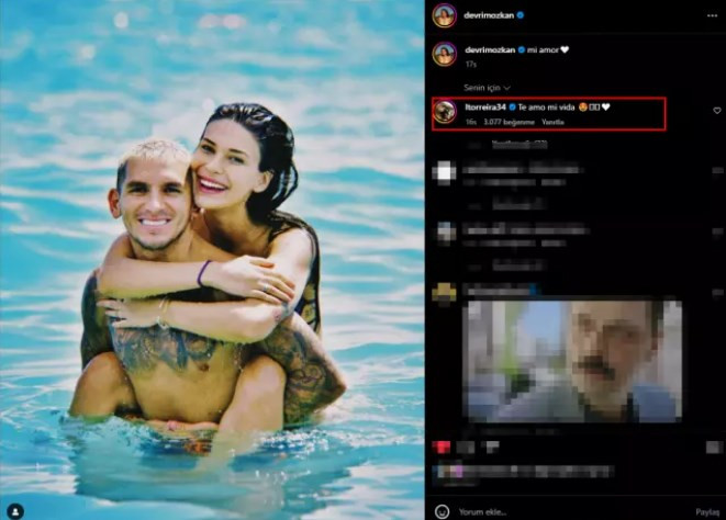 Sevgilisi Torreira ile birlikte havuza giren Özkan, sevgilisinin sırtına çıkarak poz verdi. Özkan, havuz paylaşımına İspanyolca'da 'aşkım' anlamına gelen 'mi amor' notunu ekledi. Lucas Torreira ise sevgilisinin paylaşımına, İspanyolca'da 'Seni seviyorum sevgilim' anlamına gelen 'Te amo mi vida' şeklinde yorum yaptı.