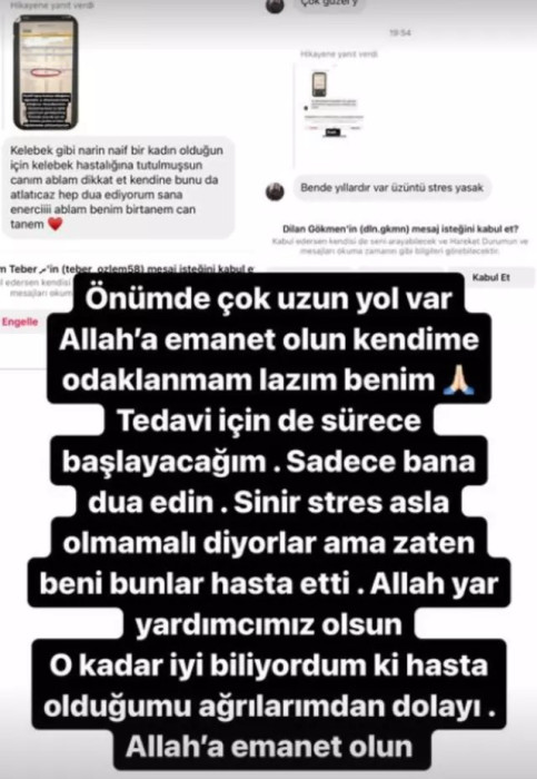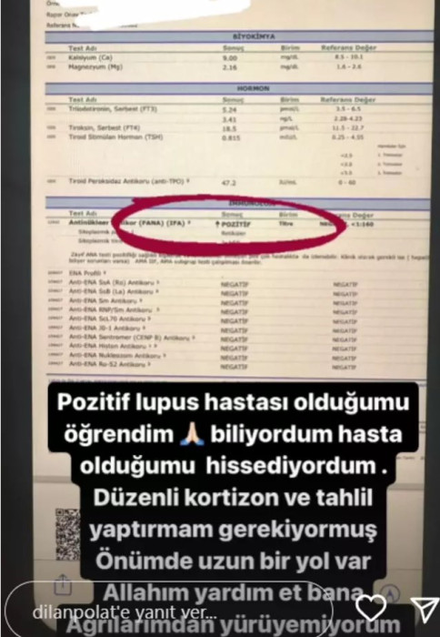 7 milyon takipçili sosyal medya hesabından açıklama yapan Dilan Polat "Pozitif lupus hastası olduğumu öğrendim. Biliyordum hasta olduğumu hissediyordum. Düzenli kortizon ve tahlil yaptırmam gerekiyormuş. Önümde uzun bir yol var. Allah'ım yardım et bana" dedi.