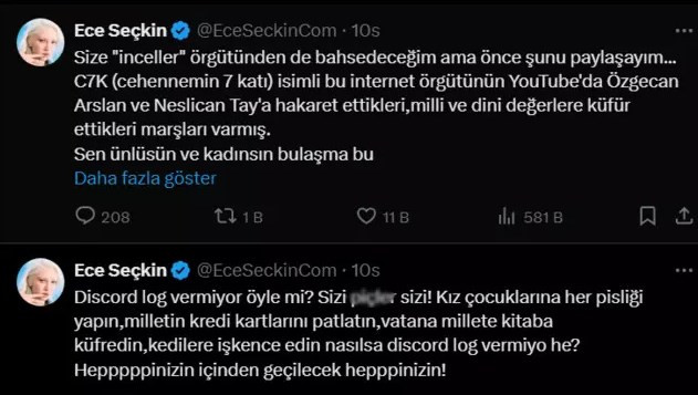 Ece Seçkin "Discord log vermiyor öyle mi? Sizi p.çler sizi! Kız çocuklarına her pisliği yapın, milletin kredi kartlarını patlatın, vatana millete kitaba küfredin, kedilere işkence edin nasılsa discord log vermiyo he? Hepppppinizin içinden geçilecek hepppinizin!" dedi.