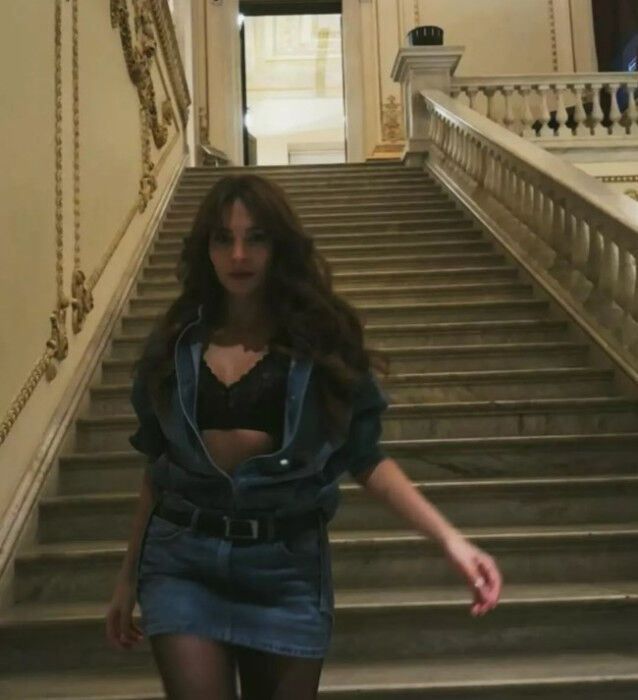 Ebru Şahin; Jean bir etek ve Jean gömlek kombini yaptı. Gömleğinin düğmelerini açan Şahin siyah dantelle iç çamaşırı ile bakana bir daha baktırdı.