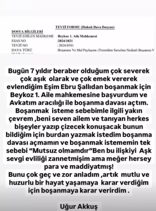 Sosyal medya hesabından boşanma dilekçesini paylaşan Akkuş, "Tek sebebi mutsuz olmamdır, ben bu ilişkiyi aşk sevgi evliliği zannetmiştim ama meğer her şey para ve maddiyatmış" dedi.