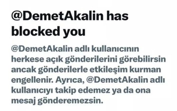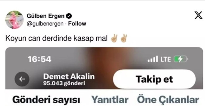Ekrem İmamoğlu'nun tutuklanmasının ardından Gülben Ergen, sosyal medya paylaşımlarıyla destek verdi. Demet Akalın ise Gülben Ergen'i engelledi. Bunu fark eden Ergen ise hesabından "Koyun can derdinde kasap mal" yazdı.