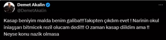 Arından da bunu gören Demet Akalın, "Kasap ben miyim? Mal da benim galiba! Narin'in okul inşaatı bitmeyecek rezil olacağım dedi O zaman kasap değildim ama! Neyse konu nazik olmasa" yorumunu yaptı.