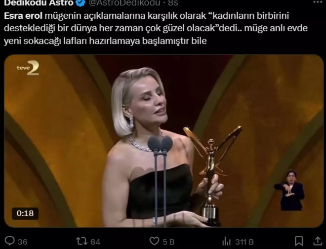 Ünlü sunucu Esra Erol'a ödülünü en yakın dostu ünlü oyuncu Bergüzar Korel verdi. Müge Anlı ise sahnede konuşmasını yaparken Çağla Şıkel'e yaptığı gönderme ile gündeme geldi.