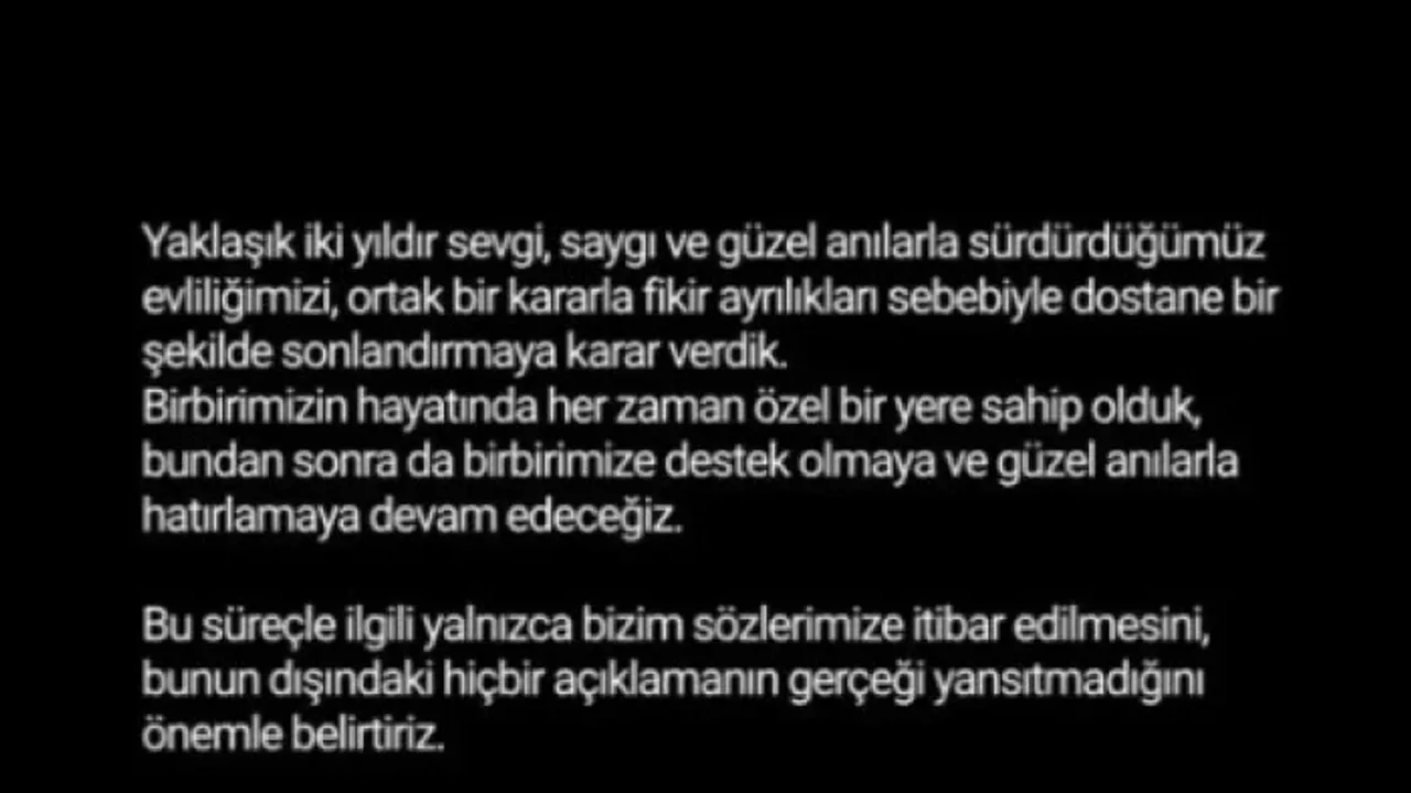 Ünlü çiftin açıklamasında "Yaklaşık iki yıldır sevgi, saygı ve güzel anılarla sürdürdüğümüz evliliğimizi, ortak bir kararla, fikir ayrılıkları sebebiyle dostane bir şekilde sonlandırmaya karar verdik. Birbirimizin hayatında her zaman özel bir yere sahip olduk" ifadeleri yer aldı.