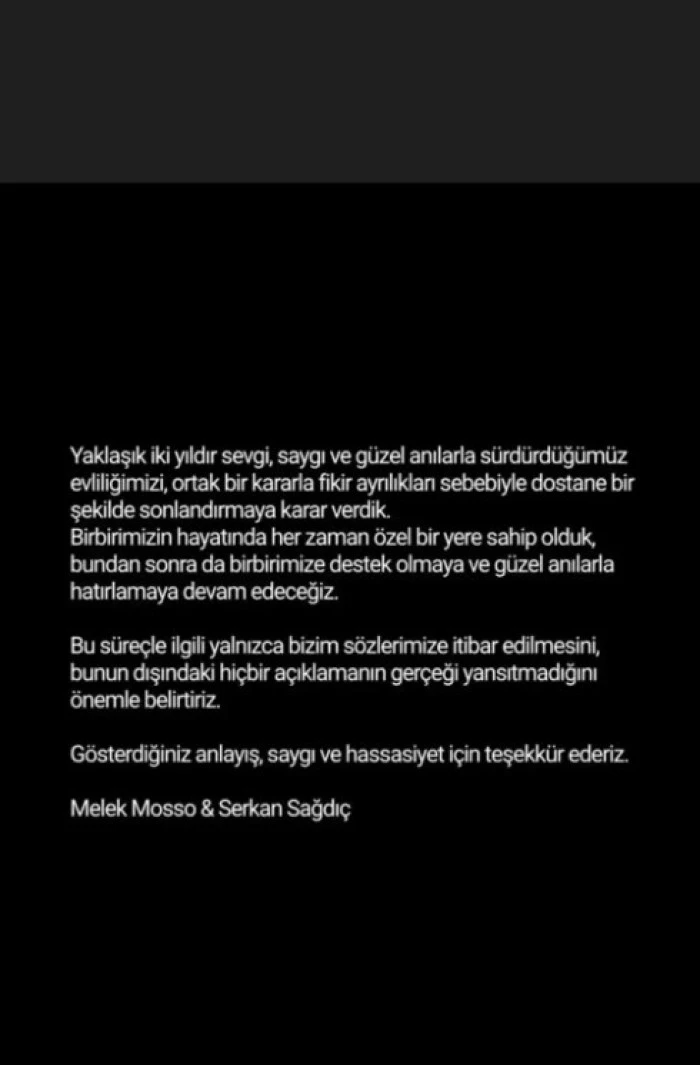 Konuyla ilgili ortak bir açıklama yapan Melek Mosso ile Serkan Sağdıç'ın neden boşandığı da ortaya çıktı.