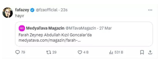Farah Zeynep Abdullah hakkında çıkan iddialara sosyal medya hesabından cevap verdi. Ünlü oyuncu 'Farah Zeynep Abdullah Kızıl Goncalar'da' haberini alıntılayarak 'Hayır' yazdı.