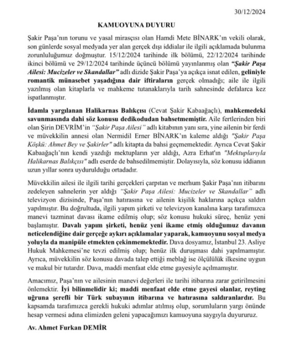 Günler sonra ise ailenin yasal mirasçısı olan Hamdi Mete Binark, "Şakir Paşa’nın hatırasına açıkça saldırı yapılmaktadır." diyerek avukatı aracılığıyla manevi tazminat davası açtıklarını duyurdu. Yapılan açıklamada Şakir Paşa'nın geliniyle ilişki yaşadığına dair iddiaların iftira olduğu belirtildi.