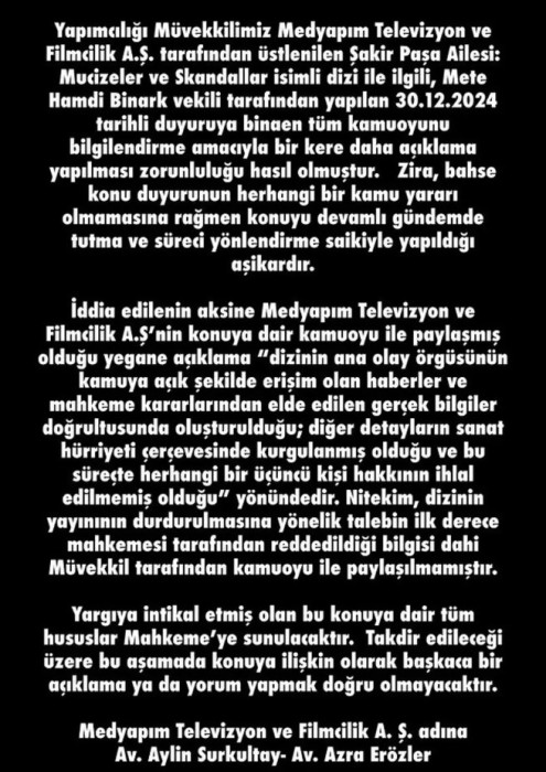 Yapım şirketi ise yaptığı açıklamada dizinin yayınının durdurulmasına yönelik talebin ilk derece mahkemesi tarafından reddedildiğini yaptığı duyuruyla başka bir açıklama ya da yorum yapılmayacağını belirtti.