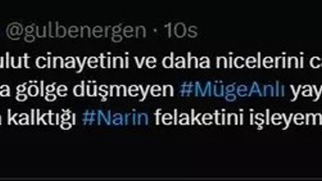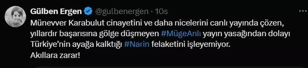 Ergen paylaşımında "Münevver Karabulut cinayetini ve daha nicelerini canlı yayında çözen, yıllardır başarısına gölge düşmeyen Müge Anlı yayın yasağından dolayı Türkiye’nin ayağa kalktığı Narin felaketini işleyemiyor. Akıllara zarar!" eleştirisinde bulundu.